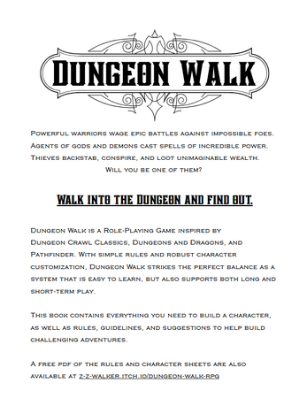 UPDATE 9/12/2025: Dungeon Walk 1.3 is out! Included are some essential- but until now unwritten- rules. Non-clerics will struggle to cast spells in armor, undesirable attribute rolls can be modified in character creation, and summoning spells now have rules to determine the summoned creature's Defense bonus. Wording has been changed on a few other spells for clarity.