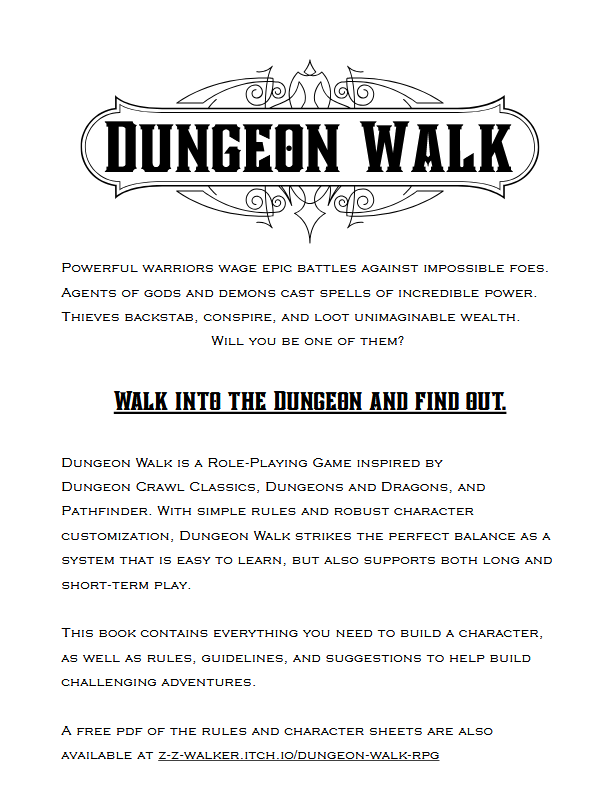 If you like DCC, Pathfinder 1e, DnD 5e, or any of the other OSR games out there, try Dungeon Walk. I guarantee you'll find something you like in here.